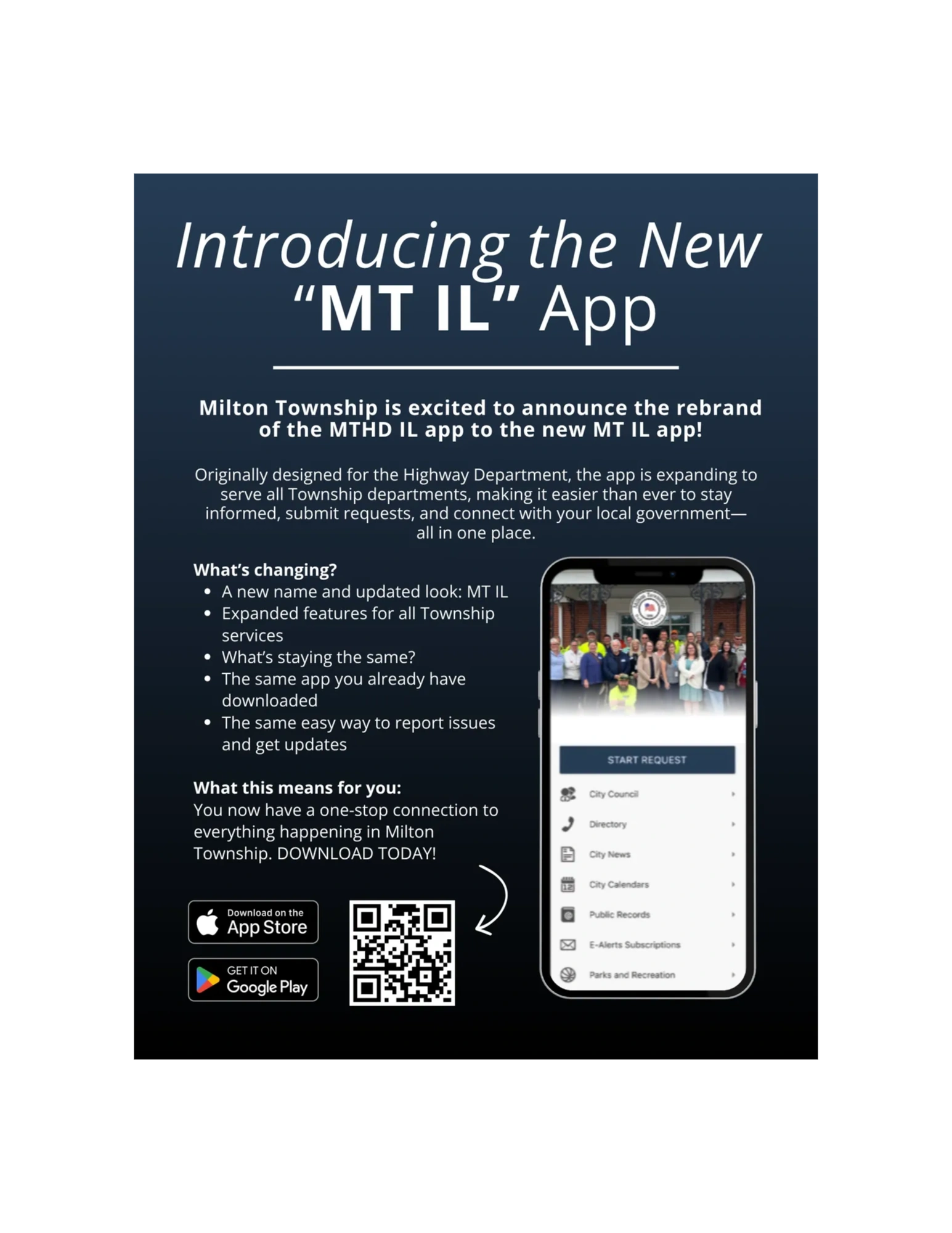 The Highway department and Milton Township with the help of GOGOV platform, have made a new APP for customer service request from residents. Download the APP called: MT IL at the app store now to get it and register. Works for both Apple and Android phones or scan the QR code here for a direct link.